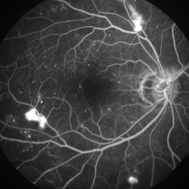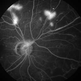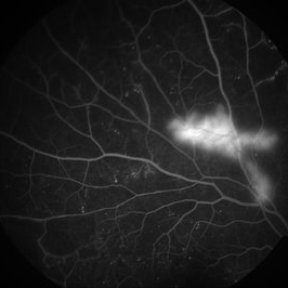 Fluorescein angiogram showing leakage secondary to neovascularization in the superior arcades.