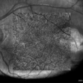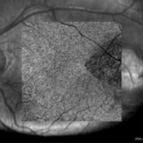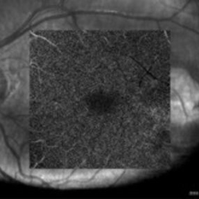 Choriocapillaris OCT-angiography of an asymptomatic 12-years-old girl with Torpedo maculopathy of the left eye. One can see a diffuse flow attenuation at choriocapillaris segmentation level at the lesion site.