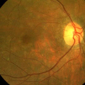 66-year-old Hispanic female with a history of severe preeclampsia at age 45. This photograph shows faint gray choroidal scars. Seen better on FA (in gallery).