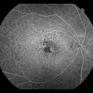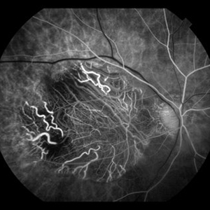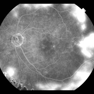 Fluorescein angiography (mid phase) of a 40-year-old man with African heritage and sickle SC disease. Sea fans are present temporal to the macula.