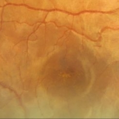 A 17-year-old healthy woman noticed a pacman-shaped scotoma in her temporal right vision. Acuity measured 20/20 and color vision measured 11/11. Possible pigmentary changes were visible at the fovea.