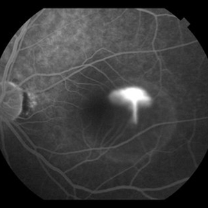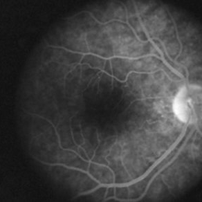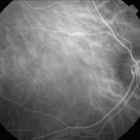 Fluorescein angiography (early/mid phase) of a 40-year-old man with African heritage and sickle SC disease. Sea fans are present temporal to the macula (leaking fluorescein).