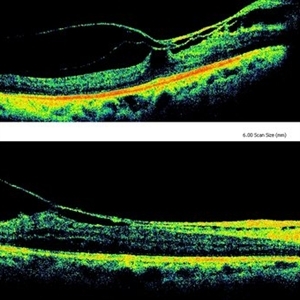 Macular traction from thickened posterior hyaloid and epiretinal membrane in a patient with lasered proliferative diabetic retinopathy. The comparison depicts spontaneous release of traction from March 2012 (lower figure) to present status, December 2013 (upper figure).