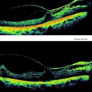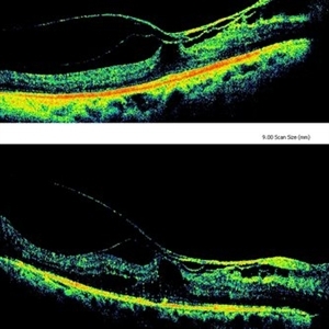 Macular traction from thickened posterior hyaloid and epiretinal membrane in a patient with lasered proliferative diabetic retinopathy. The comparison depicts spontaneous release of traction from April 2012 (lower figure) to present status, December 2013 (upper figure).