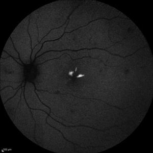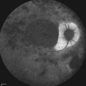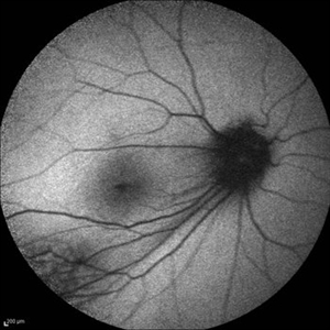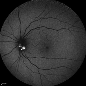 Autofluorescence imaging of the right eye of a 24-year-old woman with FEVR and optic disc hypoplasia; visual acuity of 20/50. Her brother and sister were also involved with the same ocular disorder.