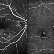 Early FA image of the left eye of a 25-year-old woman with exudative retinal detachment secondary to retinal angiomatosis (Von Hippel-Lindau).