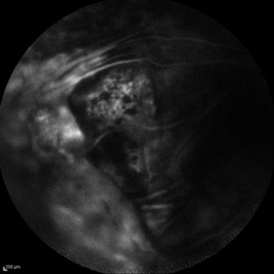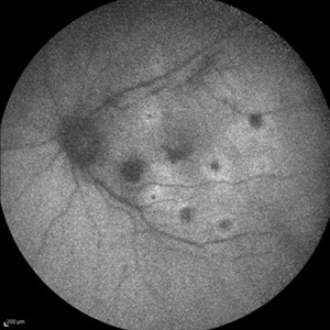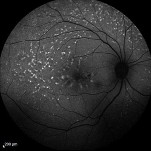 Autofluorescence imaging of the left eye of a 46-year-old man with decreased VA due to advanced Stargardt's disease.