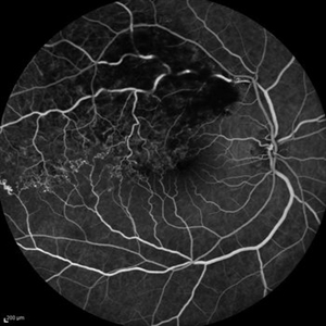 FA image of a 60-year-old woman with non-perfused occlusion of superior temporal branch of central retinal vein.
