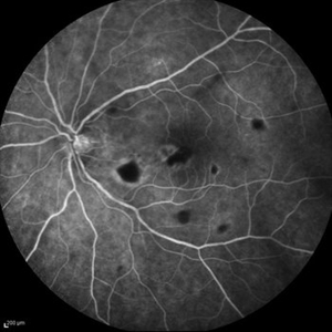 Early phase FA image of the left eye of a 55-year-old man with primary hyperoxaluria and oxalosis, Delayed filling of retinal vessels due to intravascular deposition of calcium oxalate crystals and non-perfusion of the temporal retina are visible.