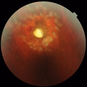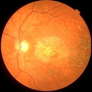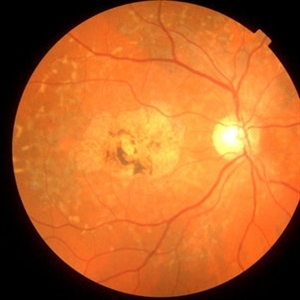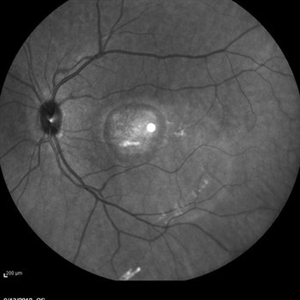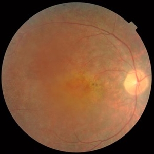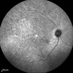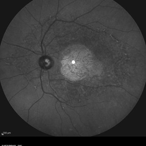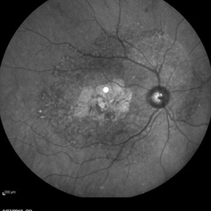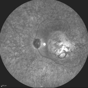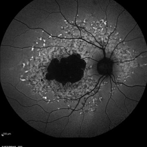 Infrared image of the right eye of a 46-year-old man with decreased VA due to advanced Stargardt's disease.
