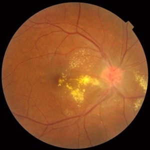 Infrared image of the right eye of a 23-year-old man with retinal vasculitis and branch retinal vein occlusion (BRVO) due to Behcet's disease .