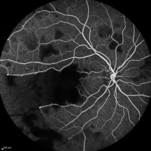 Mid phase FA image of the left eye of a 55-year-old man with primary hyperoxaluria and oxalosis, Delayed filling of retinal vessels due to intravascular deposition of calcium oxalate crystals and non-perfusion of the temporal retina are visible.