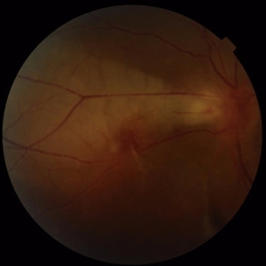 Color fundus photograph of the right eye of a 24-year-old woman with FEVR and optic disc hypoplasia; visual acuity of 20/50. Her brother and sister were also involved with the same ocular disorder.