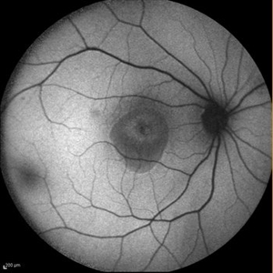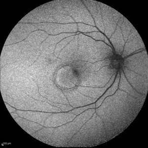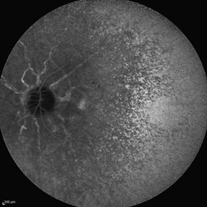 Autofluorescence imaging of the right eye of a 24-year-old woman with FEVR and visual acuity of 20/25.