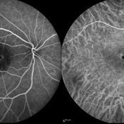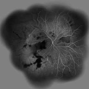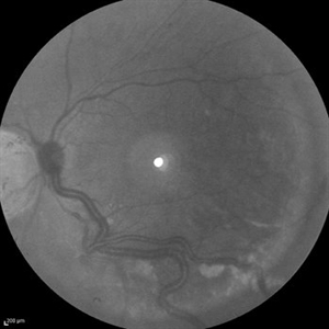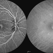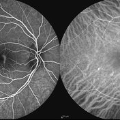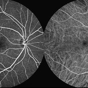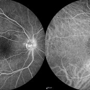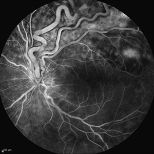 Wide field FA image of the left eye of a 24-year-old woman with FEVR and optic disc hypoplasia; visual acuity of 20/50. Her brother and sister were also involved with the same ocular disorder.