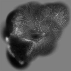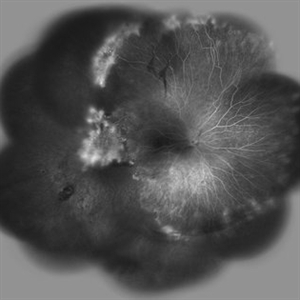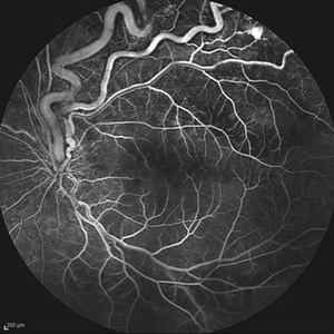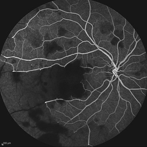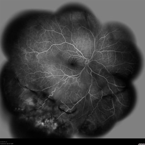 Wide field FA image of the right eye of a 24-year-old woman with FEVR and optic disc hypoplasia; visual acuity of 20/50. Her brother and sister were also involved with the same ocular disorder.