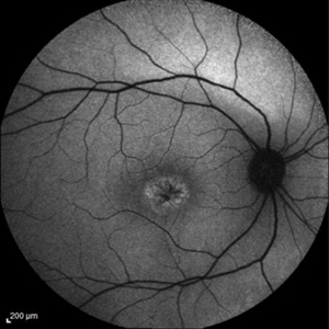 Autofluorescence imaging of the right eye of a 46-year-old man with decreased VA due to advanced Stargardt's disease.