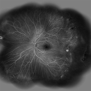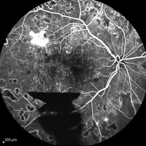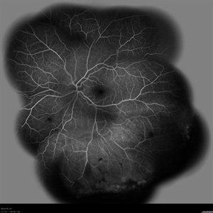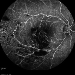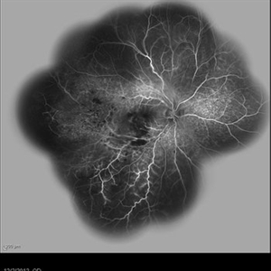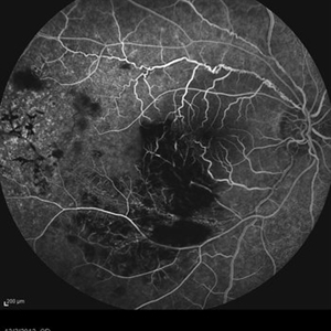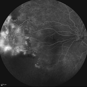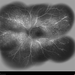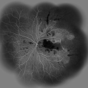 Wide field FA image of the Left eye of a 24-year-old woman with FEVR and visual acuity of 20/30.