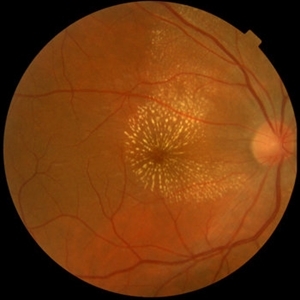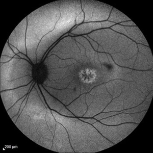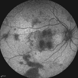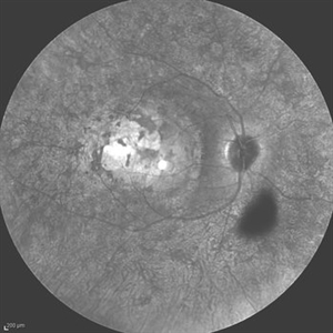 Infrared image of the right eye of a 46-year-old man with decreased VA due to advanced Stargardts disease.