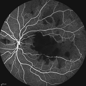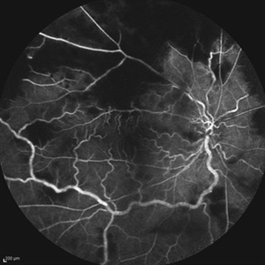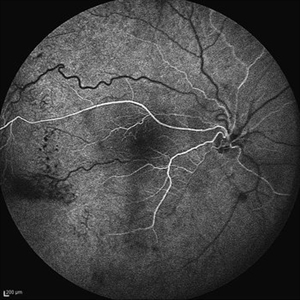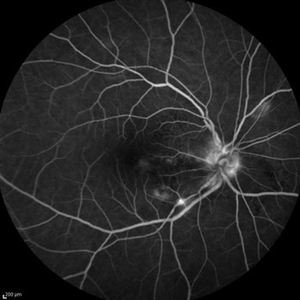 Mid arteriovenous phase FA image of the right eye of a 34-year-old man with sudden drop of vision due to CRAO. The macula is involved despite cilioretinal artery sparing .
