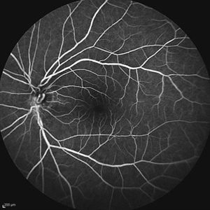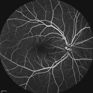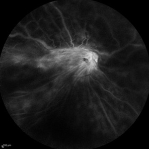 Early FA image of the right eye of a 24-year-old woman with FEVR and optic disc hypoplasia; visual acuity of 20/50. Her brother and sister were also involved with the same ocular disorder.