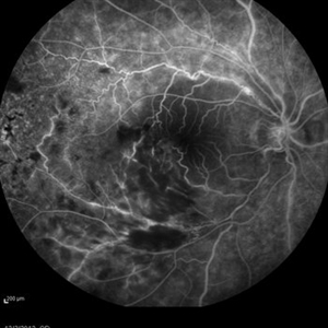 Late FA image of the Left eye of a 24-year-old woman with FEVR and visual acuity of 20/30.