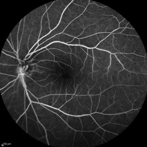 Early phase FA image of the right eye of a 34-year-old man with sudden drop of vision due to CRAO. The macula is involved despite cilioretinal artery sparing .
