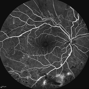 Wide field FA image of the right eye of a 24-year-old woman with FEVR and visual acuity of 20/25.