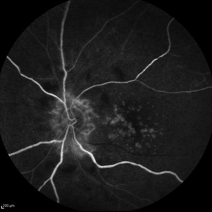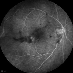 Late phase FA image of the right eye of a 34-year-old man with sudden drop of vision due to CRAO. The macula is involved despite cilioretinal artery sparing .