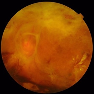 Color fundus photograph of the left eye of a 25-year-old woman with exudative retinal detachment secondary to retinal angiomatosis (Von Hippel-Lindau).
