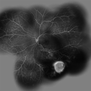 Wide field FA image of the left eye of a 25-year-old woman with exudative retinal detachment secondary to retinal angiomatosis (Von Hippel-Lindau).
