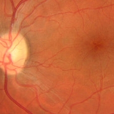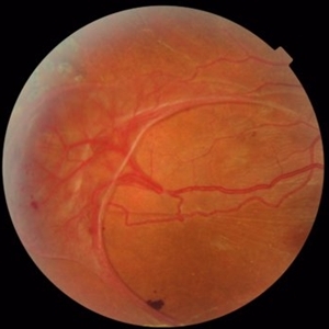 Color fundus photograph of the right eye of a 34-year-old man with sudden drop of vision due to CRAO. Please notice cherry red spot despite cilioretinal artery sparing .
