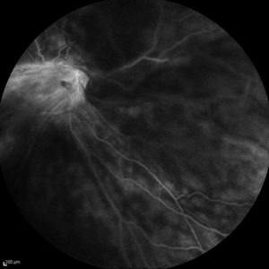 Late phase FA image of the left eye of a 55-year-old man with primary hyperoxaluria and oxalosis. Profound leakage from disc due to NVD is visible. Vasoproliferative retinopathy has occurred secondary to retinal ischemia due to intravascular deposition of calcium oxalate crystals.