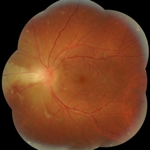 Color fundus photograph of the Left eye of a 24-year-old woman with FEVR and visual acuity of 20/30.