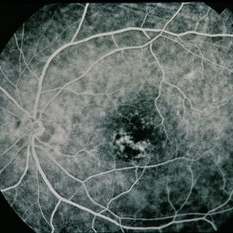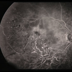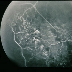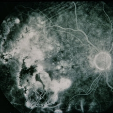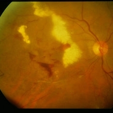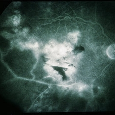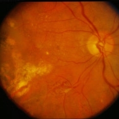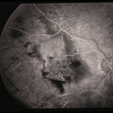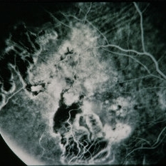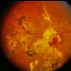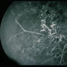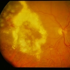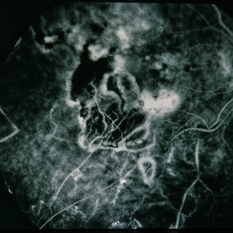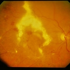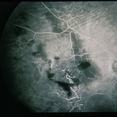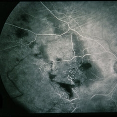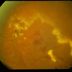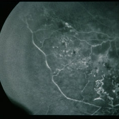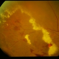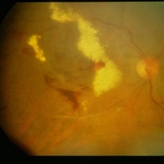 66-year-old female with BRVO - massive exudate from collaterals, 20/70 OD; 20/25 OS in 1985; +HTN, glaucoma; 20/200 OD 1987.