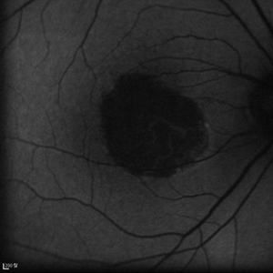 FAF image of an 78-year-old woman. Her best-corrected visual acuity was counting fingers at 30cm.