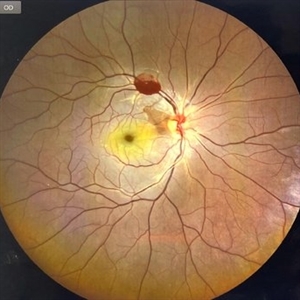 Fundus Photograph of a 25 year young male came with complain of distortion of vision in left eye for last few months. BCVA was 6/9, N6 in left eye. Retinal examination revealed torpedo maculopathy in left eye.
