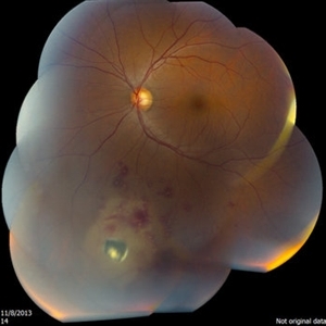 Optos wide-field fundus image of a patient with Stickler Syndrome and COL2A1 gene mutation. Patient has perviously undergone prophylactic laser. Lattice, vitreous veils, and laser scars are seen.