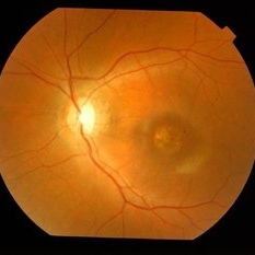 Left fundus of a 25-year-old lady with no ocular complaints shows a hypopigmented subfoveal lesion. History was significant for consanguinity of parents. OCT of this eye was relatively normal.