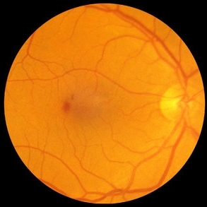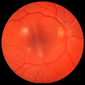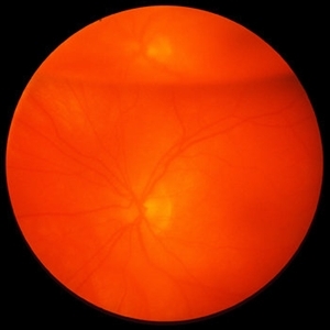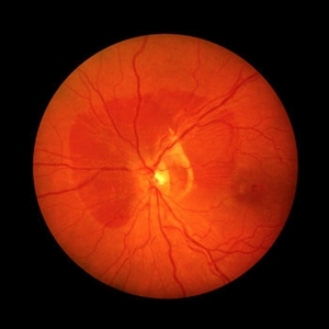 Color photograph of 75-year-old white male with 6 day history of acute vision loss. 20/40