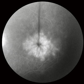 FA of 75-year-old white male with 6 day history of acute vision loss. 20/40