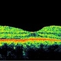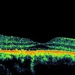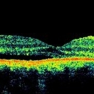 OCT at presentation on Jan 23, 2014 of the right eye of a 55-year-old male with chronic CSCR (> 3 years) shows significant subretinal fluid. Treated with avastin twice: Jan and March, 2014 with complete resolution by Jul 30, 2014.