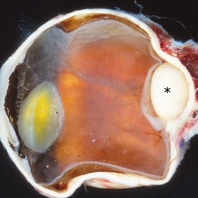 Choroidal melanoma is often asymptomatic and diagnosis is incidental. The tumors may grow beneath the retina, or may break through the Bruch membrane and disrupt the retina. Tumors breaking through the Bruch membrane and disrupting the retina have a characteristic “mushroom” shape. The enucleation specimen in (A) shows a whitish, nodular choroidal tumor at the posterior pole (*). Note the retinal detachment overlying the tumor.