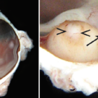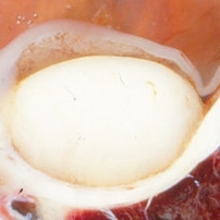 Choroidal melanoma is often asymptomatic and diagnosis is incidental. The tumors may grow beneath the retina, or may break through the Bruch membrane and disrupt the retina. Tumors breaking through the Bruch membrane and disrupting the retina have a characteristic “mushroom” shape. This enucleation specimen shows an amelanotic, dome-shaped choroidal tumor with several dilated blood vessels. The tumor has not infiltrated the sclera, ciliary body, or optic nerve. Note the retinal detachment next to the tumor (arrow).