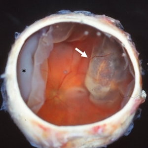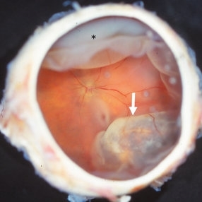 Choroidal melanoma is often asymptomatic and diagnosis is incidental. The tumors may grow beneath the retina, or may break through the Bruch membrane and disrupt the retina. Tumors breaking through the Bruch membrane and disrupting the retina have a characteristic “mushroom” shape. This enucleation specimen shows a melanotic, dome-shaped choroidal tumor (arrow). There is partial retinal detachment with underlying subretinal fluid in the area opposite the tumor (*) and slight macular edema in the posterior pole (seen in the central area of the image).