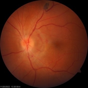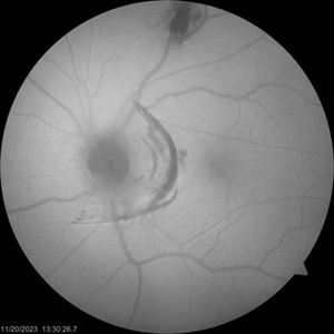 23 year old male with 10 months of vision loss prior to presentation. Clarus 700 image of lesion with CNV and dependent subretinal fluid into inferior fundus.