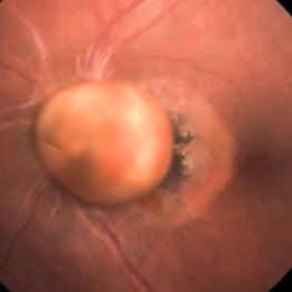 Condition/keywords: encapsulated intraocular foreign body, fundus photograph, intraocular foreign body
