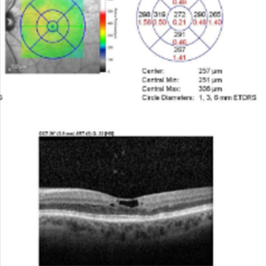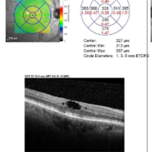 A 75 year-old woman complained of painless progressive blurring of central vision OU. She had a history of diabetes for 15 years but had never required treatment for diabetic retinopathy. Her best corrected visual acuities were 20/50 OU. She was noted to have moderate cataracts. She was noted to have mild drusen and mild epiretinal membranes and referred to the retina service. She was diagnosed with idiopathic juxtafoveal telangiectasia, type 2, which affects both men and women and occurs bilaterally. Note the characteristic pseudocysts on OCT. Note the fine telangiectactic vessels temporal to the FAZ on angiography.