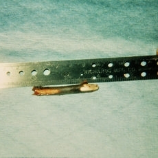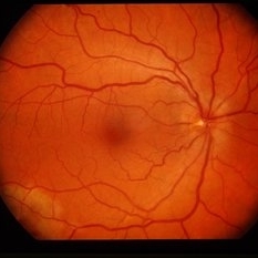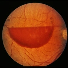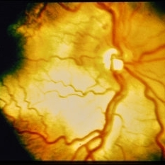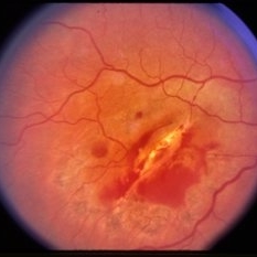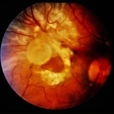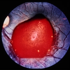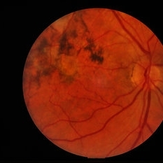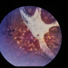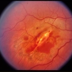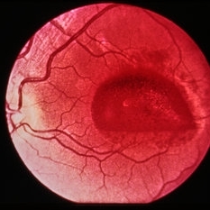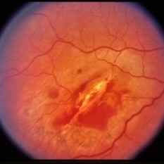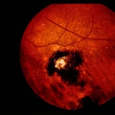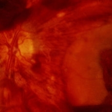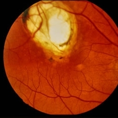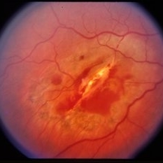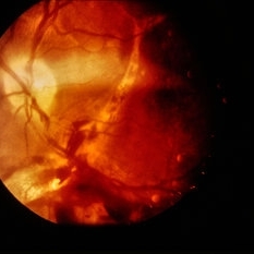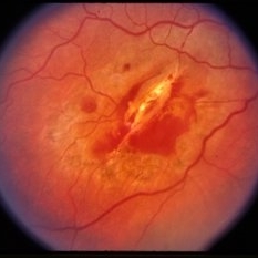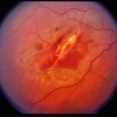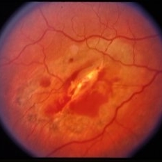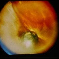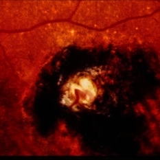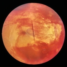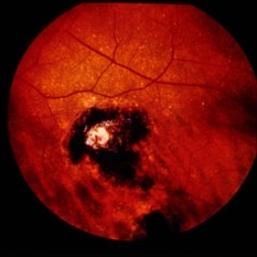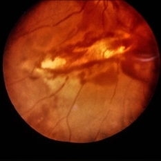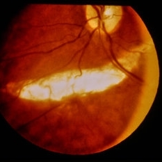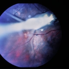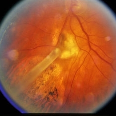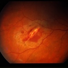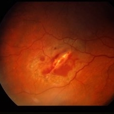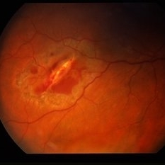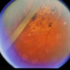 Trauma – posterior penetration – no history, probably double perforation. Some laser surround the lesion. Fundus photo, inferotemporally OD.