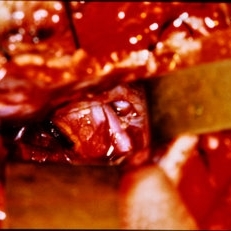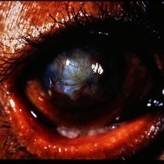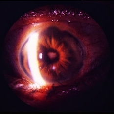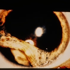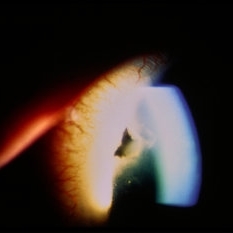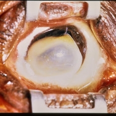 Trauma – surgical view – long scleral laceration repair; probably hypotonous eye.